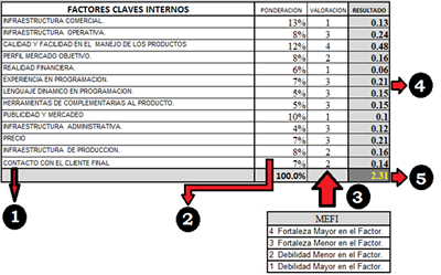 4. Resultado de multiplicar la (Ponderación–Valoración) por cada uno de los Factores Claves Internos.