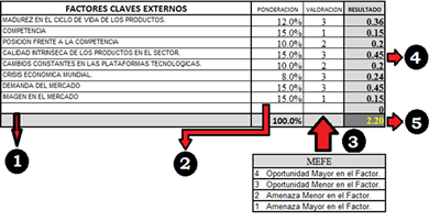 4. Resultado de multiplicar la (Ponderación–Valoración) por cada uno de los Factores Claves Externos.